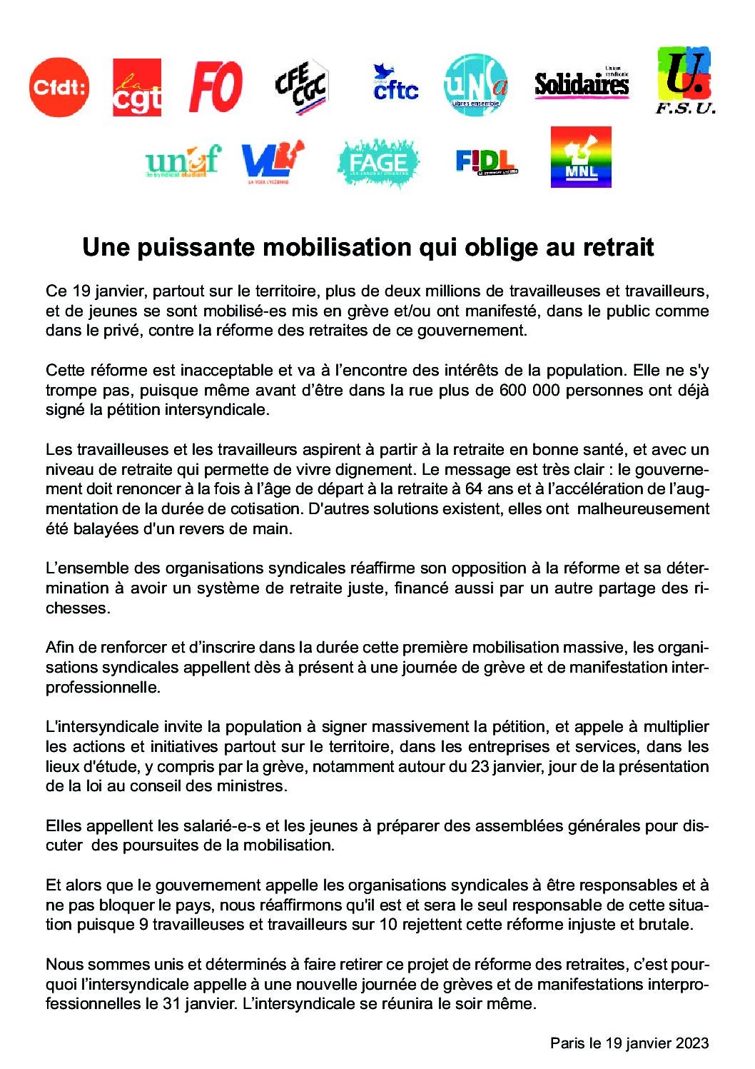 Ce 19 janvier, partout sur le territoire, plus de deux millions de travailleuses et travailleurs et de jeunes se sont mobilisés, mis en grève et/ou ont manifesté, dans le public comme dans le privé,