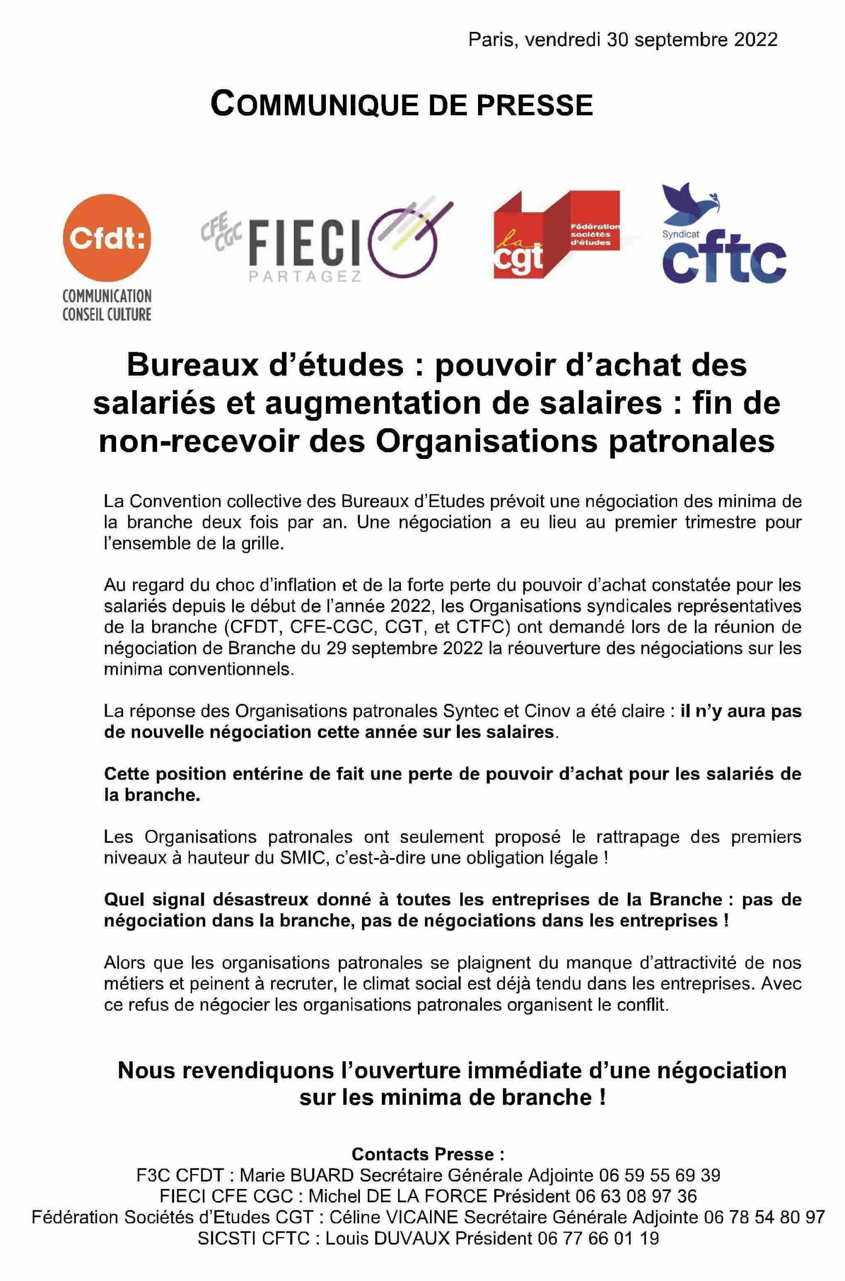 Suite au refus de la partie patronale de négocier les minima de branche, les 4 syndicats représentatifs de la branche – CFTC, CGC, CGT et CFDT – ont publié un communiqué commun (intersyndical) ci-joint. Bureaux